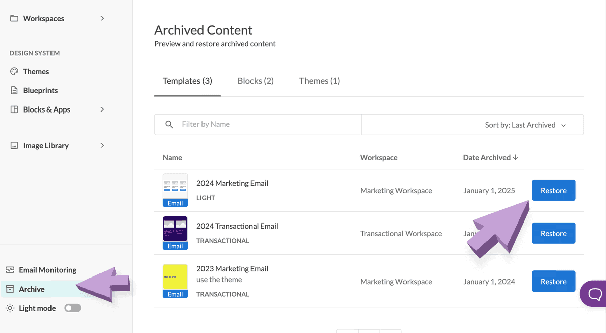 Individual emails, SMS messages, blocks, and themes can all be archived in Dyspatch.
